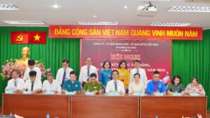 Tại hội nghị, UBND, các đoàn thể chính trị – xã hội, trưởng 11 khu phố cùng ký kết thực hiện phong trào thi đua yêu nước năm 2025.